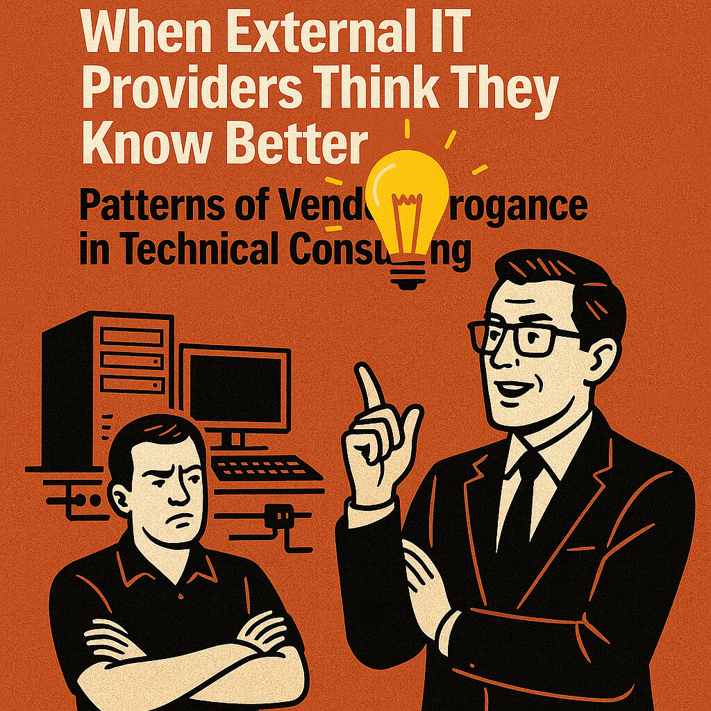 IT administrators consistently report a frustrating pattern: external providers, consultants, and vendors who arrive with superiority complexes, dismiss internal expertise, and create problems through arrogance